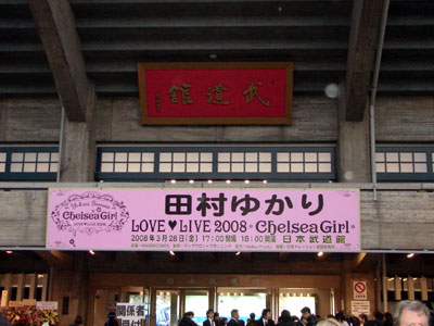 田村ゆかり“Love Live 2008 *Chelsea Girl*”日本武道館公演に行ってきました。武道館は桜満開。九段下の駅を降り、田安門を潜って武道館にいたるまで、周囲は桜、桜、。隣の靖国神社はお祭りの真っ最中。まさに田村ゆかりのライブをやるためにあるような場所・時期と言えるでしょう。物販は開場4時間前には行列が打ち切られる地獄だったようで、史上まれに見る人手。やはり、“夢とファンタジーの国「ゆかり王国」の姫、ゆかり姫が5歳の時にお歌いあそばされた伝説の国歌”の会場限定CDの引力は強力だったようです。